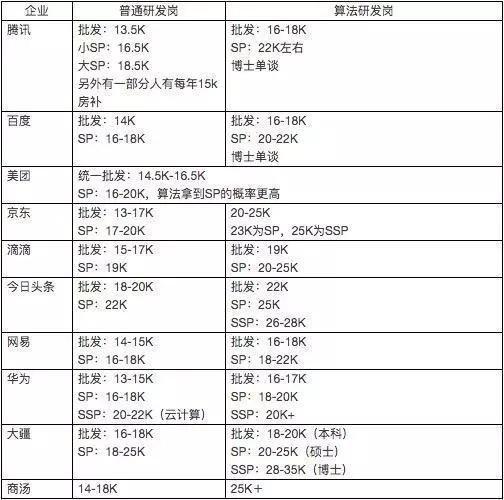 为了吸引人才,各厂纷纷开出了天价薪酬,先来看今年校招的算法类大 SP 的 offer,这都是笔者从各个渠道了解到的今年各厂给到的最高 offer(各位读者中不乏认识比表格中薪资更高的大牛):
