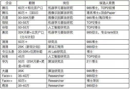 从以上数据可以很明显地看出,算法类岗位相比其他岗位在薪酬上至少高出 20%,对于顶级人才更是不遗余力地通过高薪和户口政策来吸引。一些博士毕业的人才可能初入职场就跨过了所谓月薪 3 万的大坎儿,直接「走上人生巅峰」。