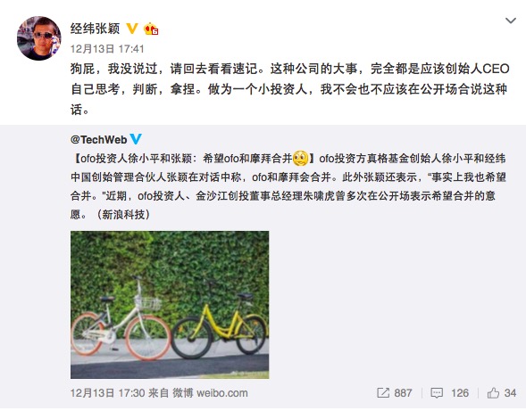 昨天,投资人张颖微博上回复媒体,“‘事实上我也希望合并’,他没说过(这种话),这种公司的大事,完全都是应该创始人CEO自己思考,判断,拿捏。做为一个小投资人,他不会也不应该在公开场合说这种话。”