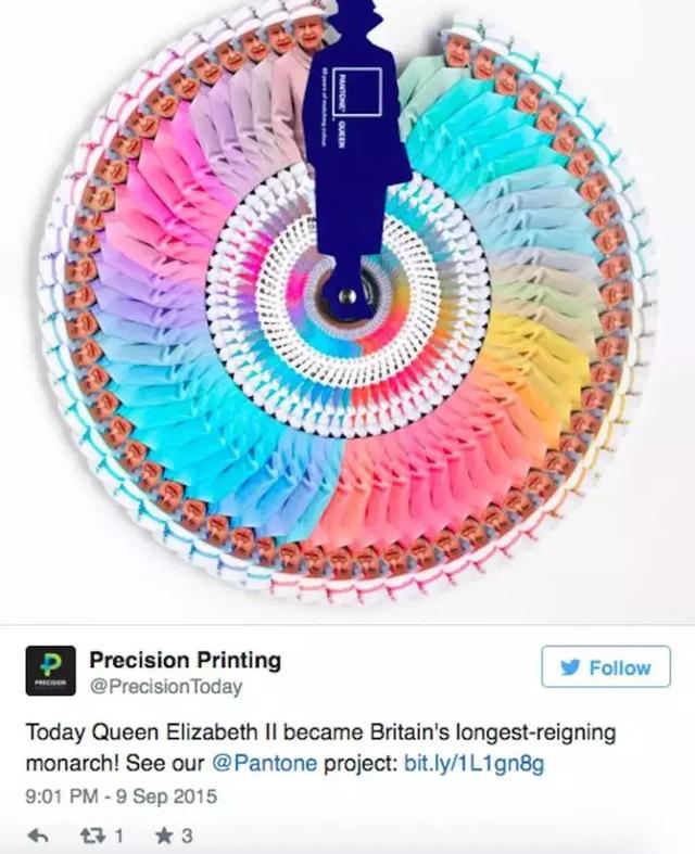 2015年,为了纪念英国女王伊丽莎白二世登基60周年,为英国政府工作的广告公司 Leo Burnett 根据彩通公司的色卡原理,以女王的经典造型做了一套设计。