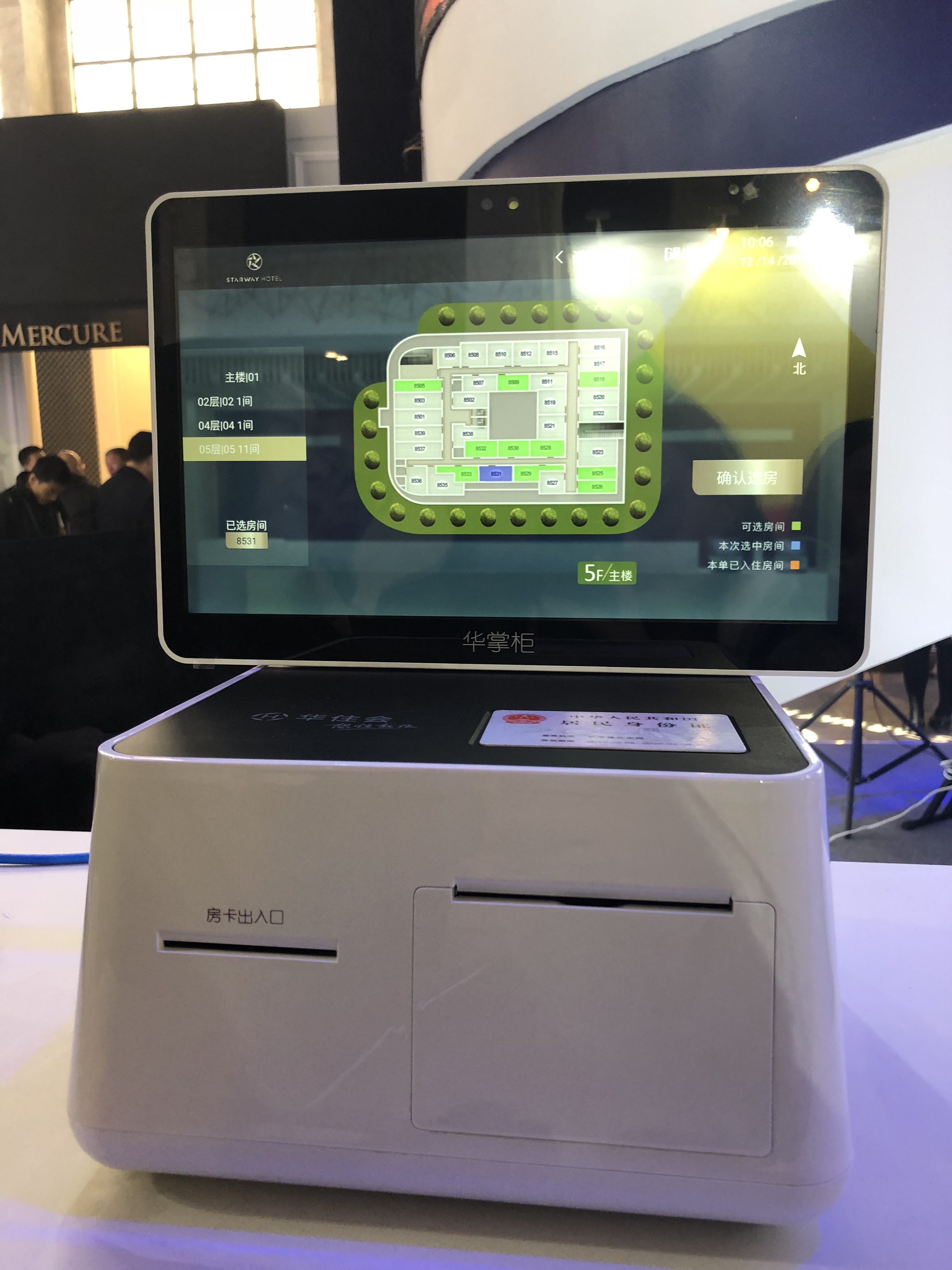 我们在现场尝试了一些科技。先来说说布局最为广泛的自助入离机,住客到店后,可通过自助终端设备,来办理入住。只需将身份证放在机器上,就可自动查验身份信息,在线自主挑选房间,完成在线支付,发放房卡。