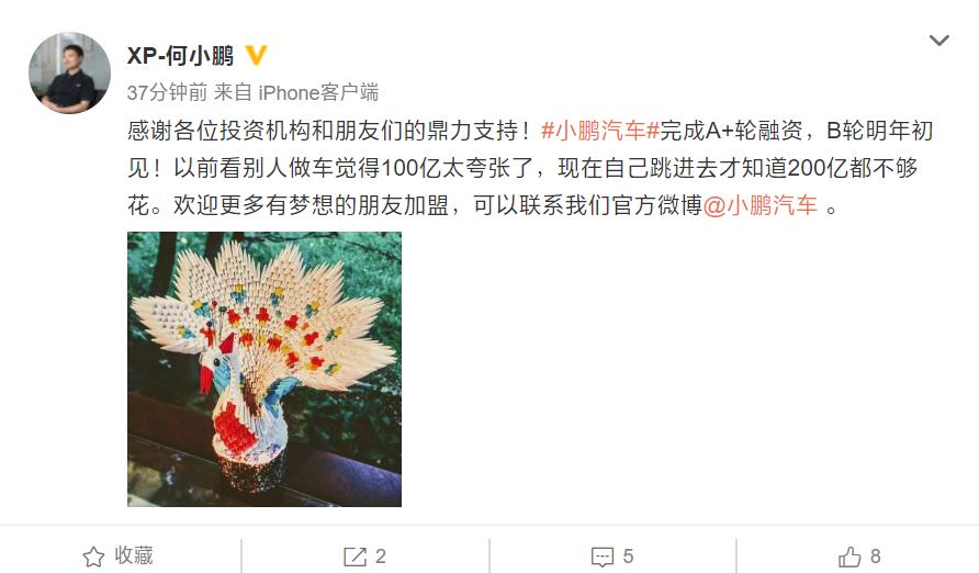 小鹏汽车宣布3轮A+轮融资结束,阿里巴巴、IDG和经纬资本等参投