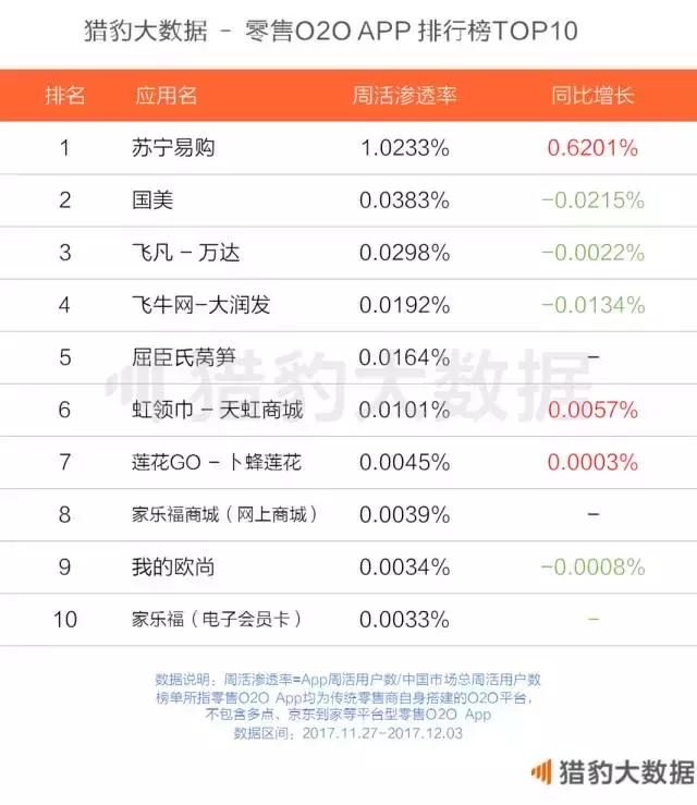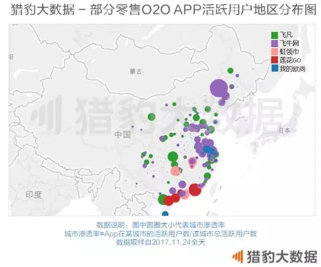 猎豹全球智库发现,除一些老牌全国连锁零售商以外,零售O2O App排行榜上还有相当一批传统零售商在某个城市或某个地区的渗透比较深,而他们的线上用户也同样集中在这些区域。