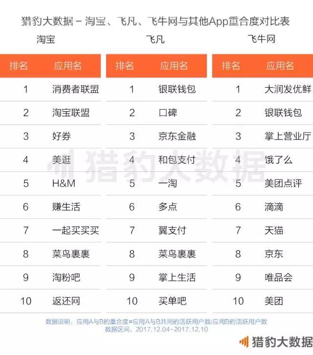 从兴趣来看,电商用户表现出一种“一切以网购为中心”的倾向,在淘宝与其他App的重合度中,排名前十的多数为导购/特卖类App;相比之下,零售O2O App用户的“烟火气”就要重一些,以飞凡和飞牛网为例,与之重合度最高的几款App都与衣食住行等日常生活的需求紧密相关,如银行理财类、移动营业厅类、生鲜电商类等等。