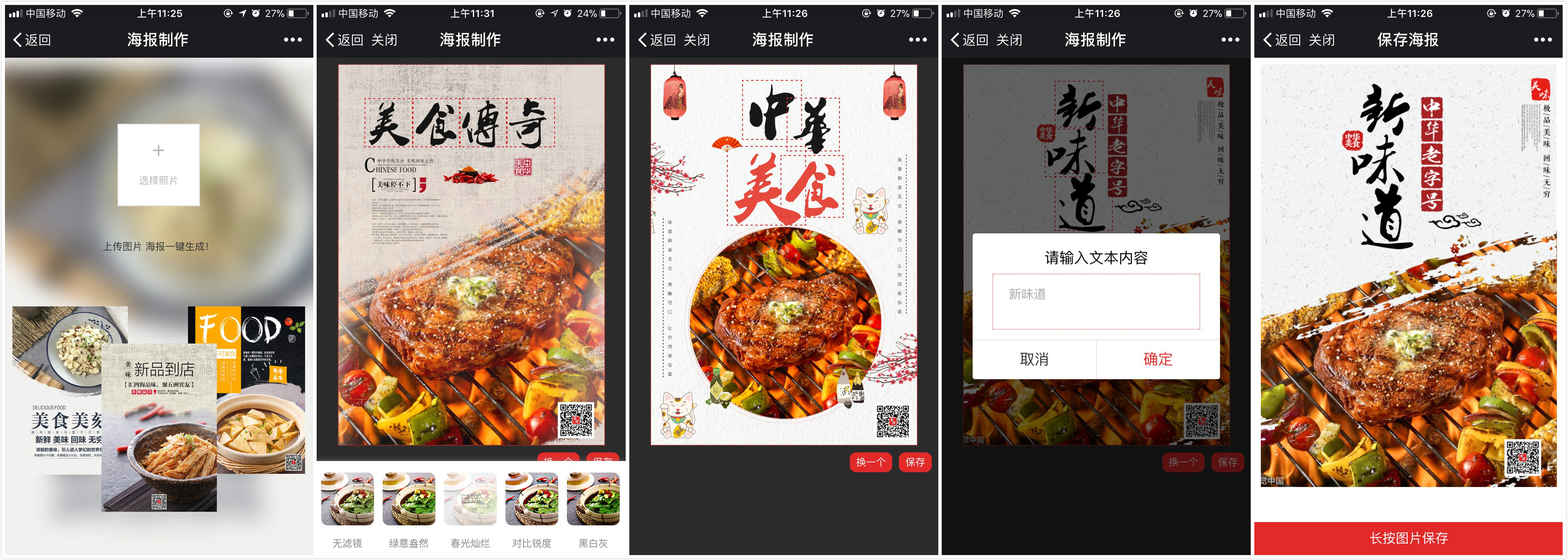 具体产品形态是一个基于微信 H5 端的,链接设计师和线下餐饮商家的平台。第一个产品是快速生成海报的应用“锋报”,用户再点击进入产品界面后,首先需要上传菜品图,根据图片的颜色、背景、大小、尺寸,系统会用相应模板为用户生成对应海报,可自行编辑文字。如果不满意,另换模板即可,整个过程约为10分钟左右。由于模板较为单一,形式稍显简单,用“锋报”生成的海报用途多为线上营销。