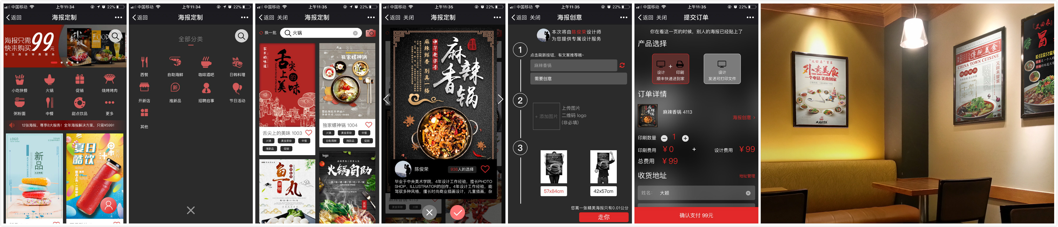 如果用户中意某设计师但不满意该设计师所上传的模板图片,可自行上传图片/Logo 并添加设计要求、电话和店铺名称。设计师设计完成后会将 PDF 版本的海报发送至平台,平台再转给印刷厂。本市用户当天就能收到海报成品,其他用户48小时内能收到货。该产品主要适用于餐饮店的线下营销活动。