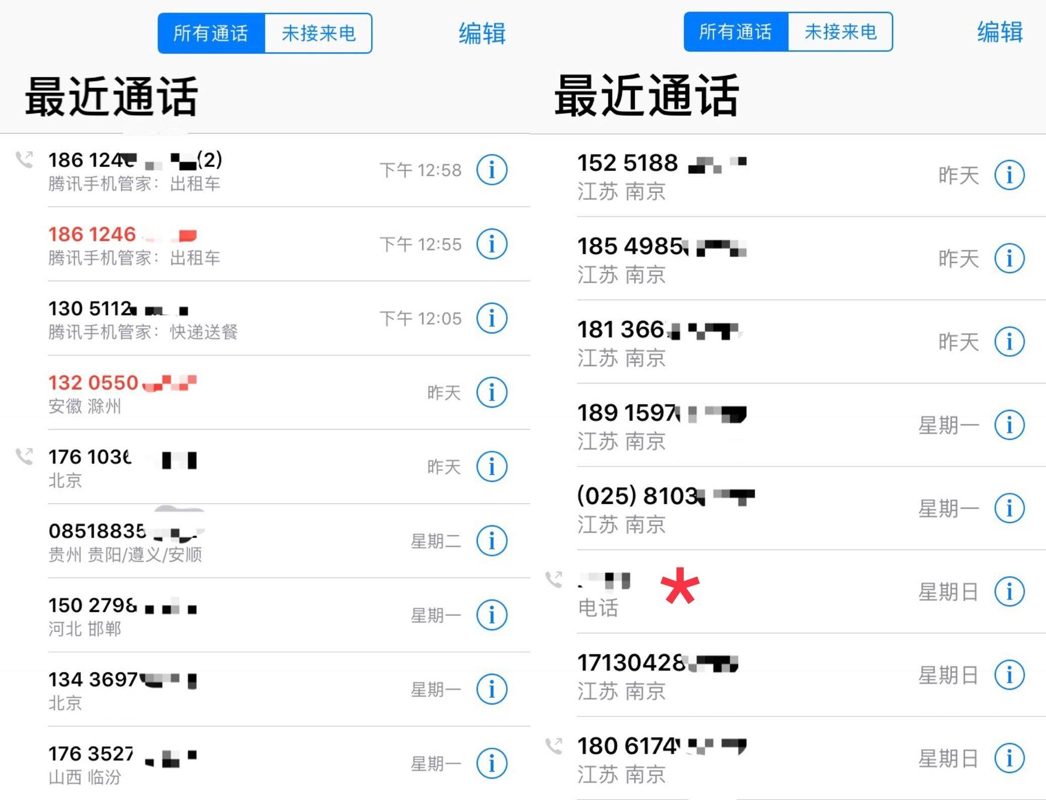 这是我和我一位朋友的「最近通话」记录,红色星标是他唯一拨出的熟人号码,「那次是给室友找手机」,他如此解释道。