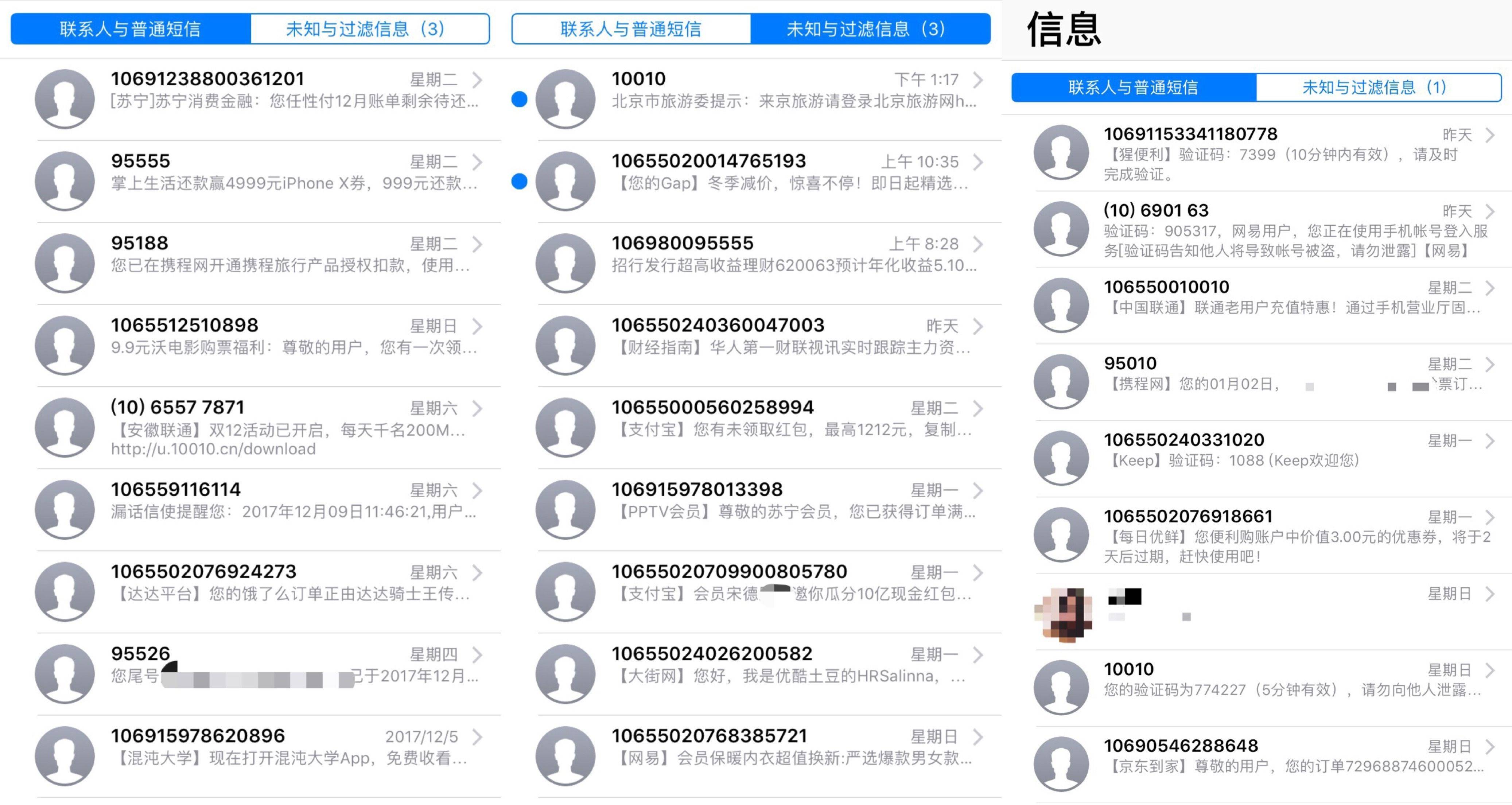 通过第三方软件屏蔽了「退订」这一关键词之后,过滤信息的数量明显超越了普通的服务短信,而在另外一个用来注册很多账号的手机上,短信功能俨然成为了查收验证码的工具。