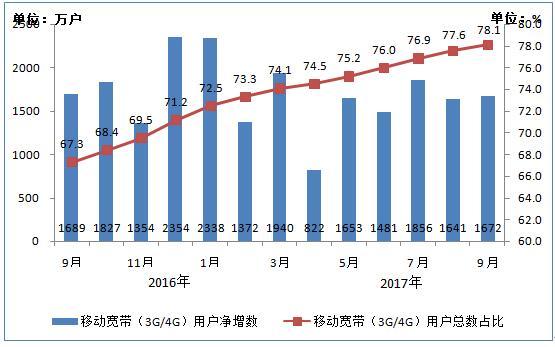 2016-2017 年 9 月移动宽带用户当月净增数和总数占比情况;图片来源:工信部
