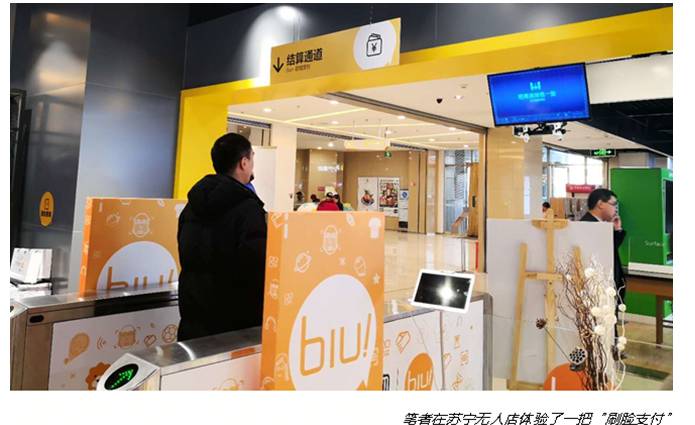 为了研究刷脸支付能够给顾客带来何种影响,笔者到苏宁无人店体验了一把。与之前网上流传的支付宝刷脸支付视频不同,苏宁的刷脸支付无需再输入手机号码的后四位进行验证,只需事先在“苏宁金融”App中录入自己的脸部信息,便可实现在购物全程只需对着摄像头刷脸两次(包括进店一次,支付结算一次)就可完成买单,哪怕是做鬼脸、戴帽子甚至是遮住自己的半张脸也能够轻松被识别出来。此外,根据顾客在店内的浏览记录,终端设备还可以显示出商品推荐的有关信息,这也是一个亮点。