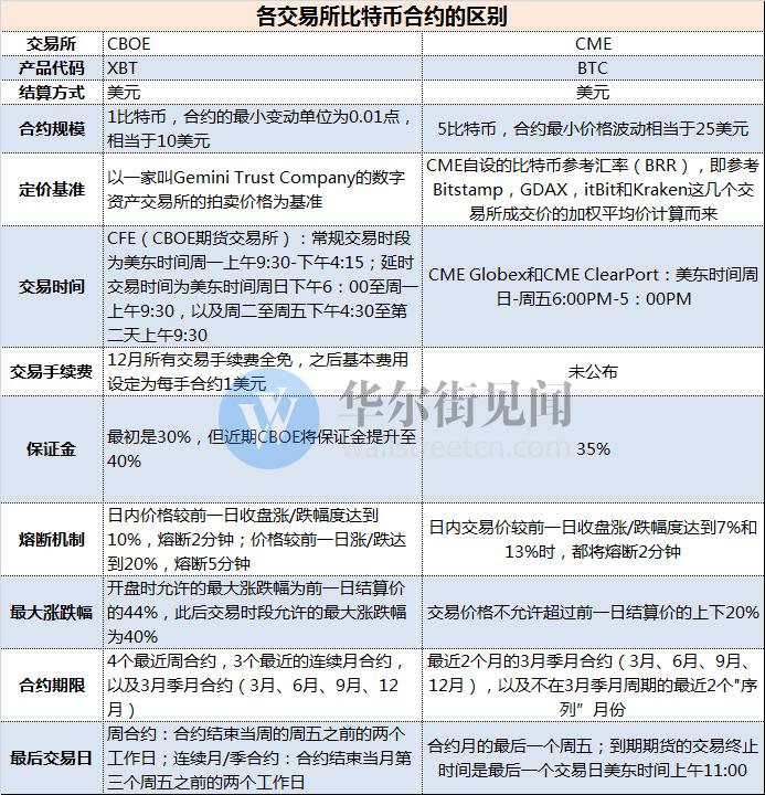见闻主编精选文章《比特币期货终上线,这是你需要知道的一切》指出,比特币冲破天际的势头,让不少投资者尝到甜头,但是对于正规金融机构来说,他们却始终没有合适的渠道参与进去。而为了解决这个“痛点”,CME和Cboe就在推出比特币期货的跑道上开始了明争暗斗。不过,这两家交易所推出的比特币合约还是有颇多区别。