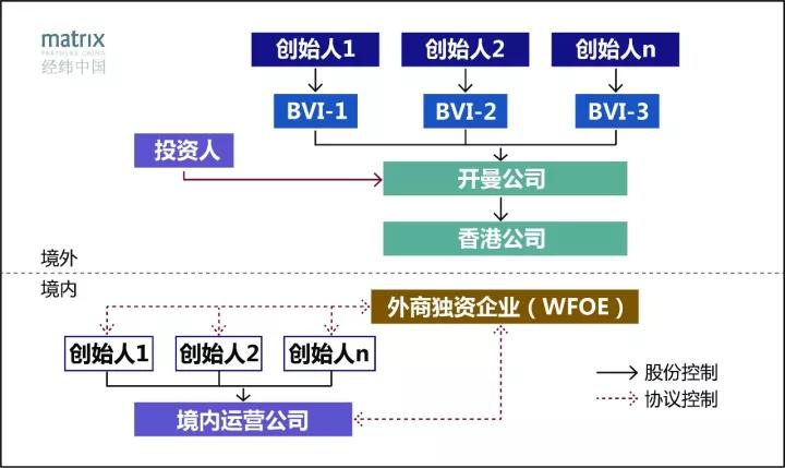 搭建VIE架构,创始人需在一些离岸地(最常见的是开曼群岛和英属维尔京群岛)设立离岸公司,并按照相关外汇管理规定完成返程投资的外汇登记,进而通过其海外设立的公司在国内设一个外商独资企业(“WFOE”),然后国内运营公司、创始人与WFOE签署一系列控制协议,完成海外融资实体对境内运行公司的实际控制。完成这一圈手续,平均需要三、四个月时间。一个典型的VIE架构如下图: