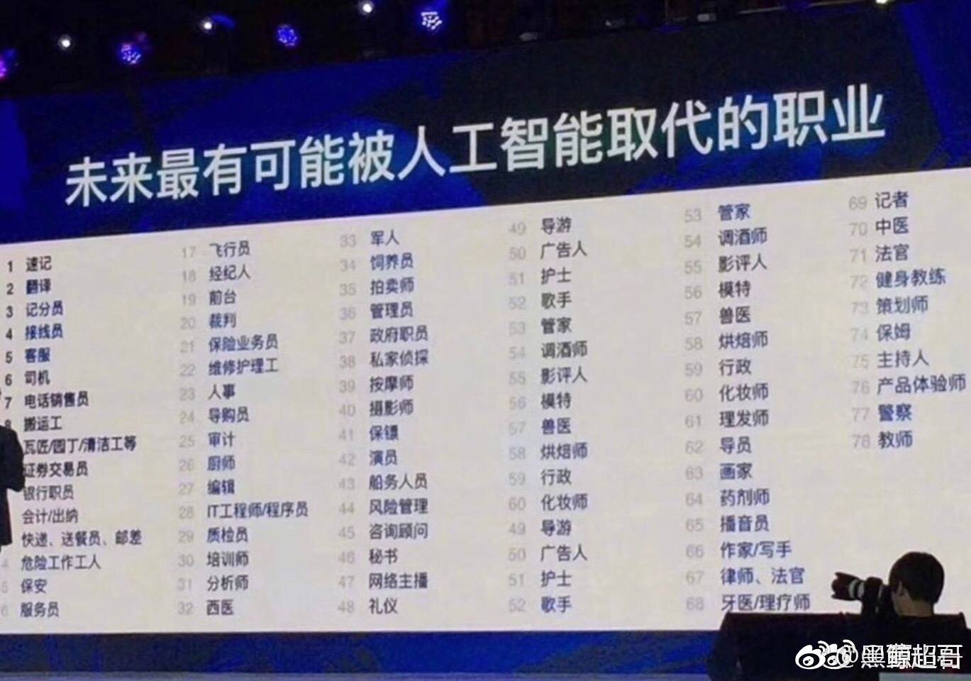 最近在一次人工智能大会上,一张人工智能将取代人类职业的图火遍了朋友圈。