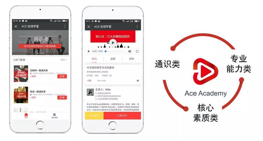 在上课方式上面,在前期,爱思益主要以线下和线上 QQ、Skype、YY 直播为主,今年,团队上线了移动端产品“在线学堂AceAcademy”,提供在线测评、录播教程、课后习题等服务。