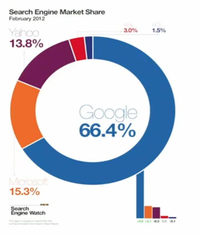 比如,从搜索引擎市场来看,Google在美国占据了66.4%的规模,老二、老三分别只有15.3%、13.8%的份额,一家独大;