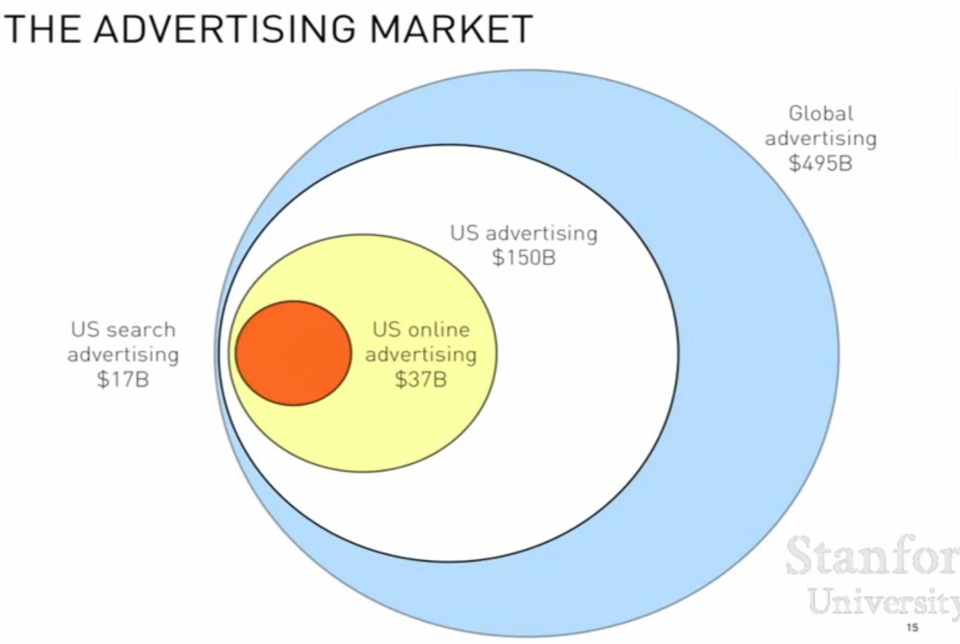 但是,从营收来看,Google有90%以上收入来自广告,所以它可以定义的竞争对手可大可小了:美国搜索广告市场?美国在线广告市场?美国广告市场?还是全球广告市场?看起来,每一个都说得通。