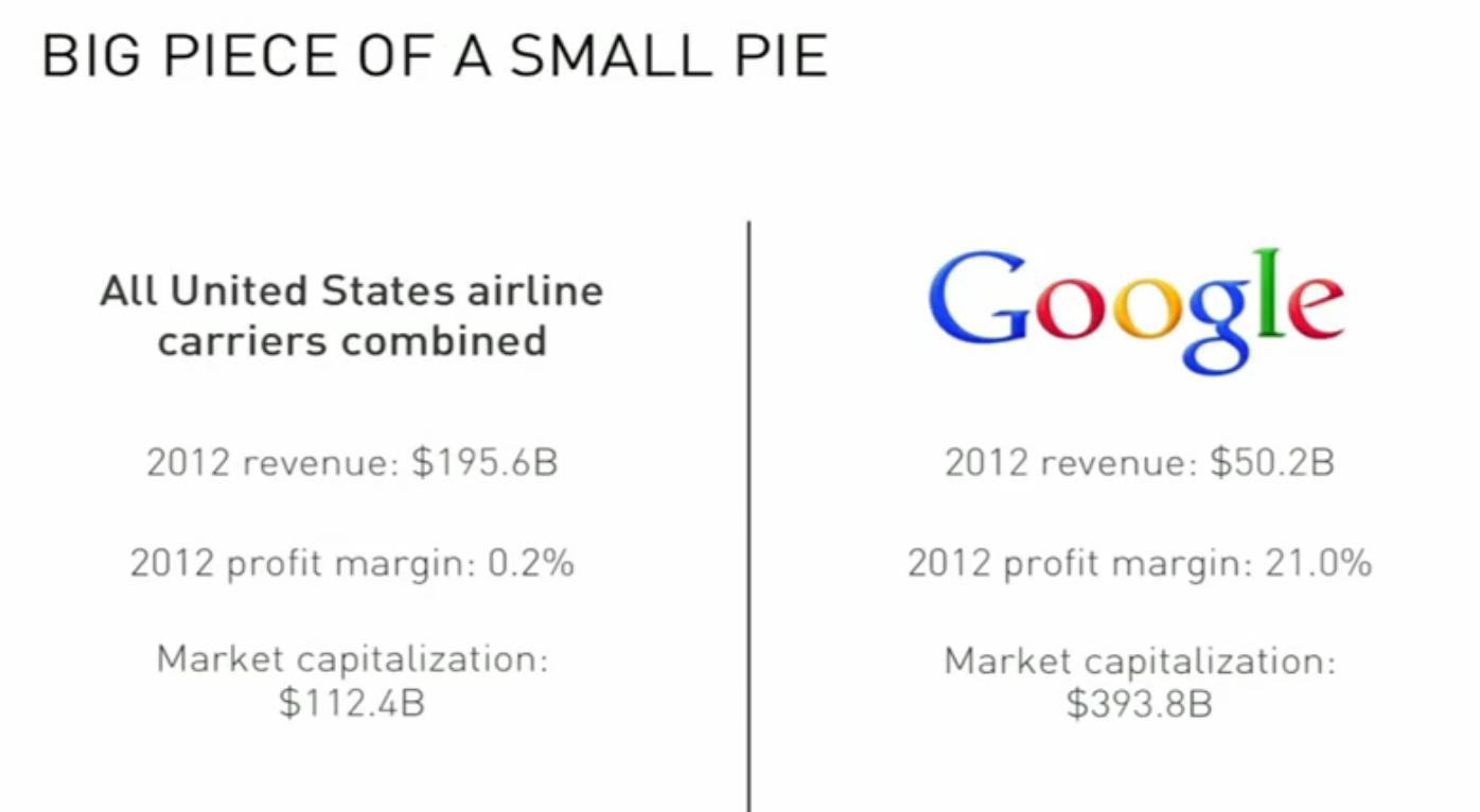 以航空公司为例,2012年全美航空公司总收入是1956亿美元,Google总收入是502亿美元,相差几乎四倍。但航空业总利润极低,只有0.2%,大约3.9亿美金,而Google的利润达到21.0%,利润为105亿美元,是美国航空公司的27倍。而美国所有航空公司的总市值加起来为1124亿美元,Google则为3938亿美元,差不过是四倍的差距。Google用相当于全美1/4的营收,获得了27倍的利润以及4倍的总市值,这是从0到1的价值的直观展现。