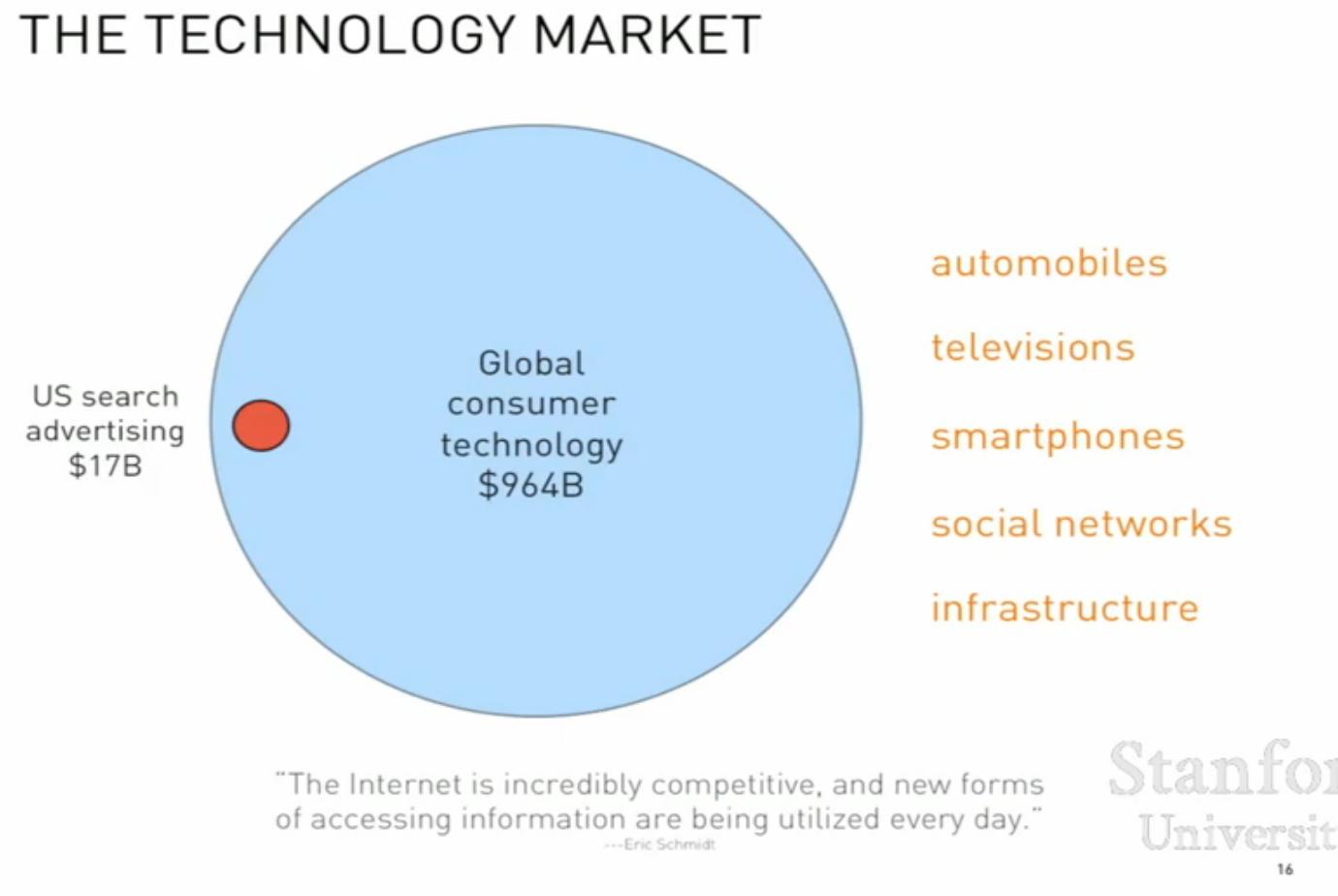 如果再从Google所涉及的业务来看,Google有自动驾驶汽车、电视、智能手机、社交网络、基础架构等各种业务,如果放在整个科技行业市场来看,Google的营收,则小到几乎可以忽略的程度。