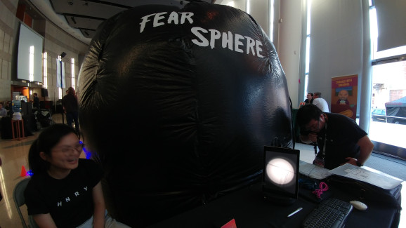 Fear Sphere是一种联机合作游戏:一位玩家在充气膨胀的圆顶帐篷内爬行,准备找到走出一个虚拟迷宫的通道,另一位在帐篷外的玩家带着地图,指导里面的玩家行动。这种游戏体验的创造者是纽约一家游戏开发工作室Hnry,成员只有三人。Fear Sphere获得了国际独立游戏节IndieCade 2017年年度游戏奖的提名,今年三月还赢得了世界游戏开发者大会(GDC)的游戏替代控制方案奖。