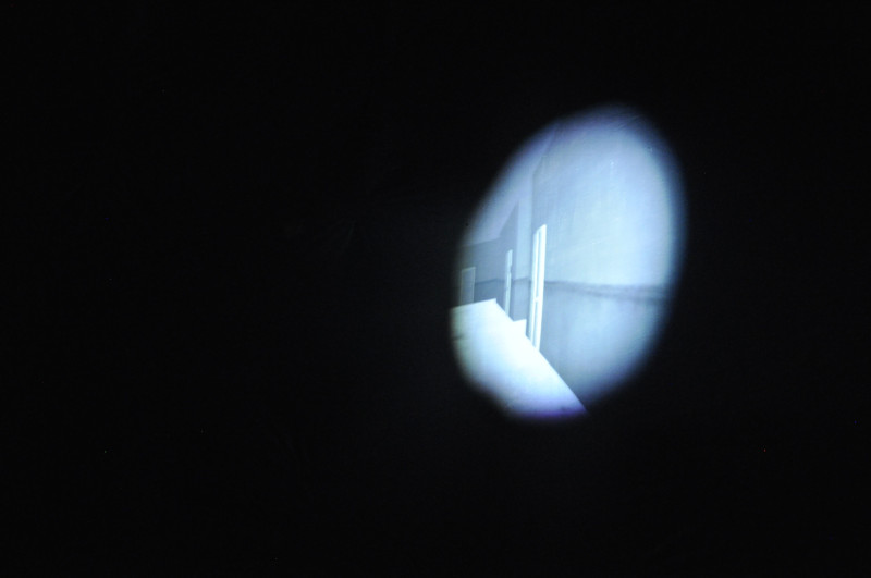 我在玩Fear Sphere游戏的时候,帐篷外面的搭档通过耳机用很小的声音询问我,让我描述一下我周围的环境,接着指示我走上一段楼梯。我晃动手电筒,到处查看四周,周围各不相同的角落暴露出来。我拿着游戏用的操纵杆,把它伸到前面到处探路走。这真的还原了现实世界里被困在某种无助的紧张氛围。在帐篷里,人有时会分不清方向,有时又像幽闭恐惧症患者一样提心吊胆。