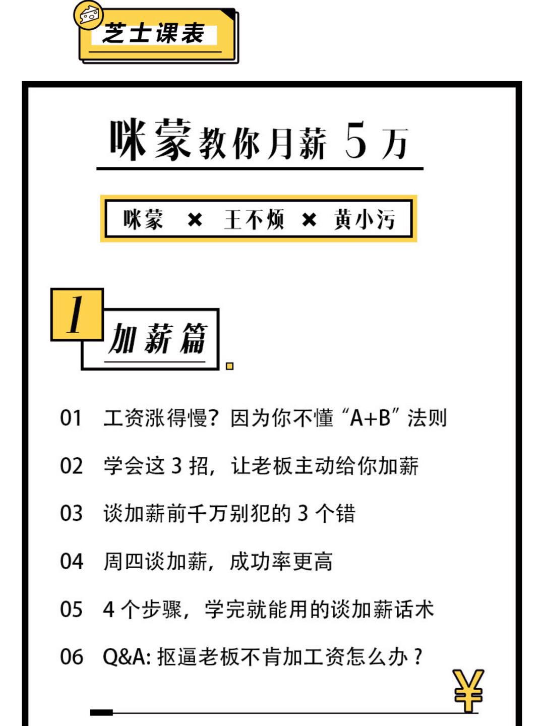 针对加薪,王不烦把课程分为加薪篇、升职篇、跳槽篇,将自己作为HR对加薪的经验制作成课程“干货”。咪蒙和王不烦都强调,课程传授的“经验”而非“知识”,经验更有实用性,可以让粉丝知道具体怎么做。