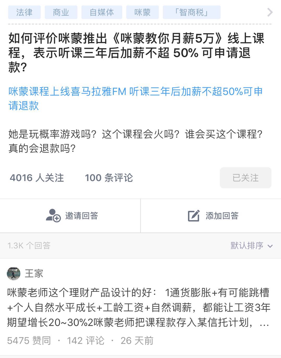 然而,外界对咪蒙开设的加薪课程提出许多质疑。在知乎、微博等公开平台,不少评论认为买课是“收智商税”,即便不购买咪蒙的加薪课程,以三年工作经验,再加上通货膨胀等因素,涨薪超过50%本身就是必然结果。