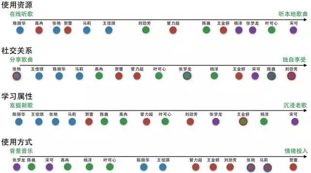 我们对关键行为分别做出行为轴,根据访谈收集的信息把用户放到行为轴上。每个受访者在轴上的位置是否精确并不重要,他们之间的相对位置关系更为重要,不同轴上的受访主题集群之间具有明显不同的行为模式。