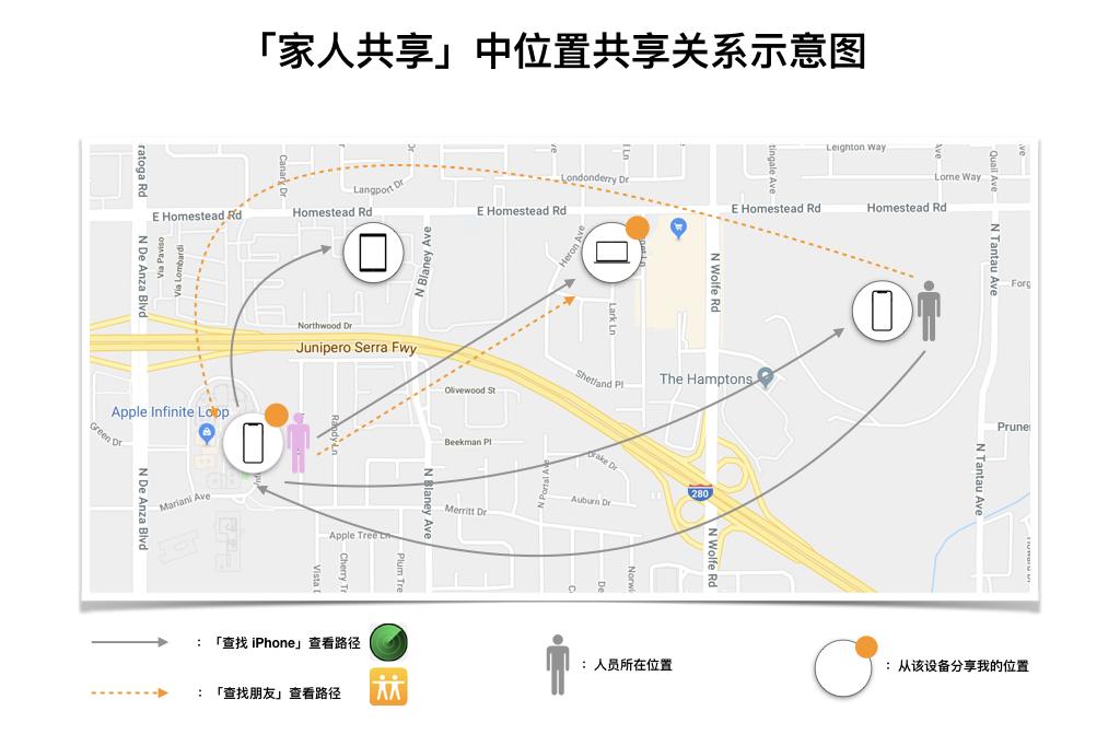 「位置共享」主要涉及「查找朋友」与「查找 iPhone」两款 App。他们有一个本质的区别:前者是共享「人」的位置,后者是共享「设备」的位置。所以具体到「家人共享」时,他们在使用逻辑上会有一些不同以往的体验。