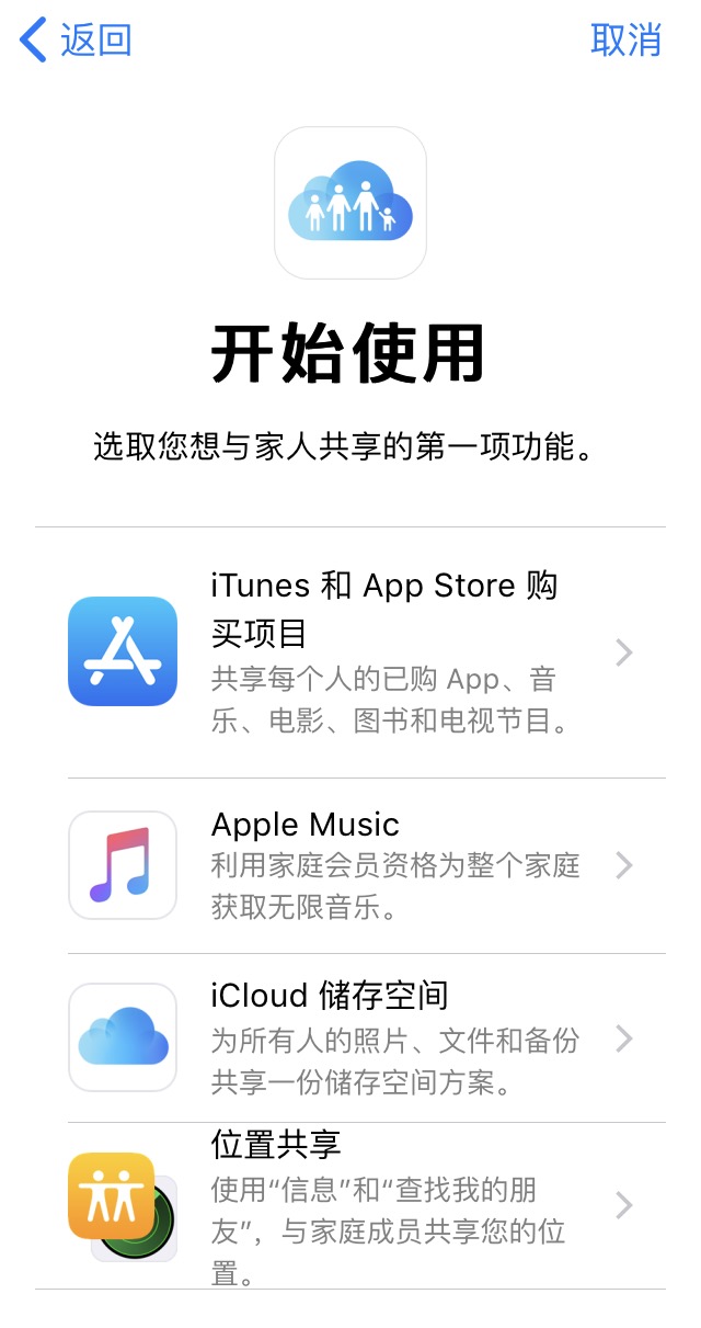 点击「设置 - Apple ID - 设置家人共享 - 开始使用」,便会来到开始使用页面。