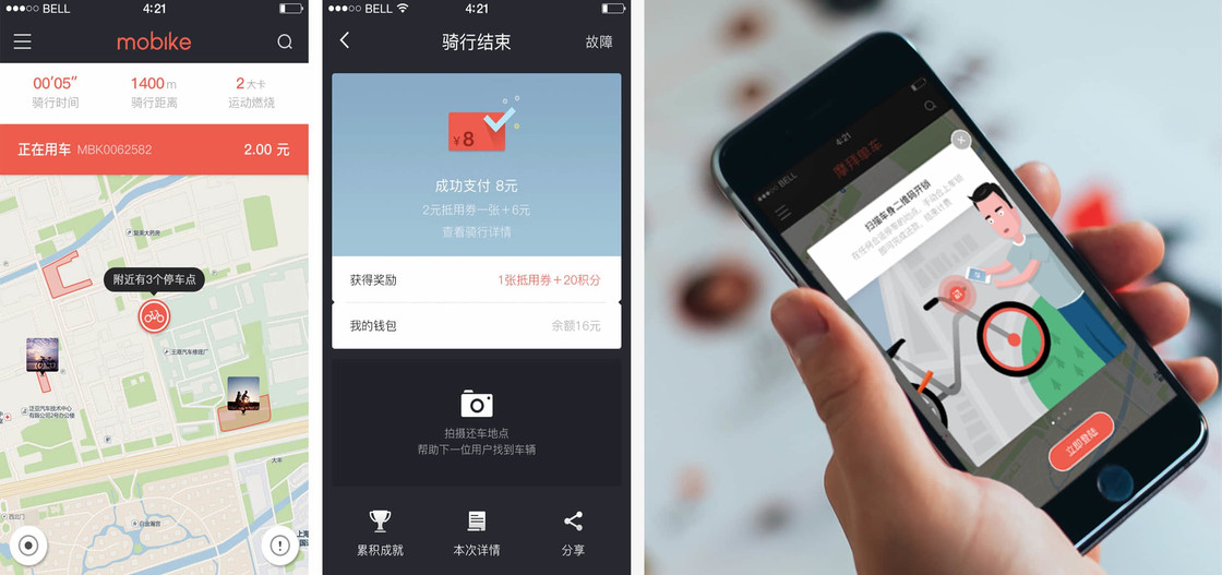 《摩拜单车》App 的功能设置背后也花了不少心思。一般情况下,用户是没有义务也不愿做那些除了使用产品本身之外的事情,比如实名认证、还车拍照、个人中心等,设计团队通过有趣不生硬的设计,来引导用户有动力去完善这些设置选项,给用户带去了更好的使用体验。