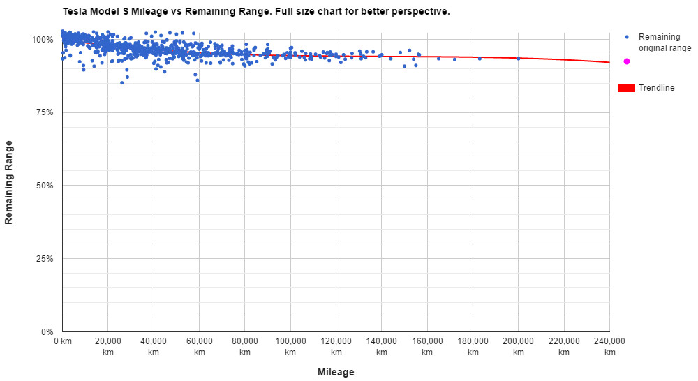 特斯拉什么水平?去年11月,荷兰比利时特斯拉论坛收集了全球各地286位Model S车主提交的电池充放电数据。这些实际运行的数据可能比特斯拉官方数据可信度还高。数据显示,在行驶10万英里后,大多数Model S的电池组容量将衰减至出厂原始容量的95%;在行驶20万英里(约32万公里)后,电池组容量将衰减至出厂原始容量的90%。