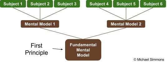 很多人都忽略了知识也是垂直的。我注意到,伟大的思想家和实干家就是这样看待现实的。有更深层的原则和思维模型将我们研究的各种学科知识连接起来。如下图所示: