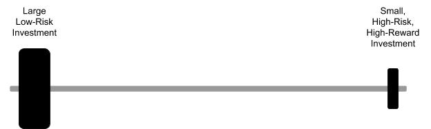 (4)降低投资风险,避免在那些未来不会成为赢家的领域内投资。在本文中,我并不是建议你完全忽略未来。我想说的是你要平衡你对趋势的理解和永远不会改变的东西:永恒的原则和思维模型。Nassim Taleb是一位非常成功的投资人,也是《黑天鹅》、《反脆弱性》等书的作者。在他的《反脆弱性》( Antifragile)这本书中,他提出了一种资源方法,这种方法可以将收益回报最大化,同时能够消除损失。他将这种方法称为“杠铃策略”: 即对不确定性的所有解决方案,都是以杠铃的形式呈现的。Taleb用杠铃将极端情况分隔开,杠铃有一个杠轴,两端加重,一面是极端的风险厌恶,一面是极端的风险偏好,而不采取“中等程度”或温和的风险态度,因为人们一般明白“高风险”和“零风险”的概念,但是中等风险则有很大的迷惑性,因为它受巨大的测量误差的影响。比如,如果你的90%的资金以现金形式持有,或以所谓的“保值货币”储存起来(假设剔除通货膨胀影响),而剩下10%的资金则投资于风险很高的证券,那么你的损失不可能超过10%,而你的收益是没有上限的。如果某个人将100%资金都投入所谓的“中等”风险的证券,那么它很可能由于计算误差而承受毁灭性的风险。