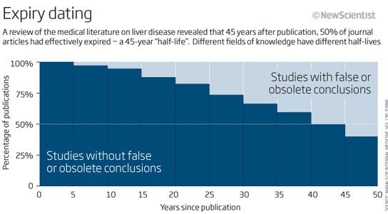 有些知识形式出现得很快,但很快就会过时。其他形式的知识在很长一段时间内都不会过时。信息和知识过时的速度是如何加快的?我在之前的文章中说过:“例如,一项学术研究发现,关于肝硬化和肝炎的临床知识准确性的衰变率为45年。换句话说,如果你和一位没有及时更新自己知识的70岁的肝脏专家交谈,你有50%的概率会得到不准确的坏消息。工程学位的寿命从从1930年的35年已经降至1960年的大约10年。”