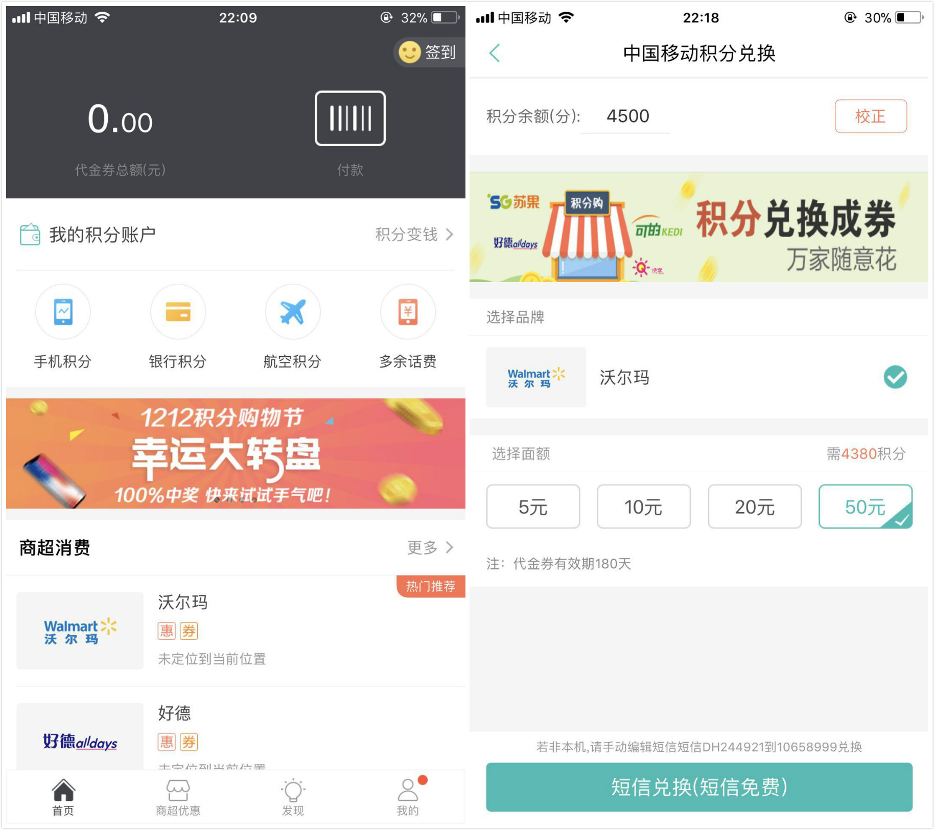 从兑换体验上,拉卡拉积分购App查询积分很方便,兑换也很划算,以中国移动积分为例,4380分就能换一张50元的沃尔玛代金券。对比中国移动自身的积分商城,5000积分才能换一张50元的家乐福或者物美代金券。