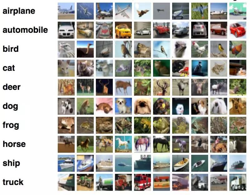 图片分类器的训练需要用到带标签的图片,其中每张图片均属于数量有限的类别中的一种或几种。例如,CIFAR 10 数据就是训练图片分类器所用的一种标准化数据集,其中已正确添加了标签的图片共属于 10 个类别: