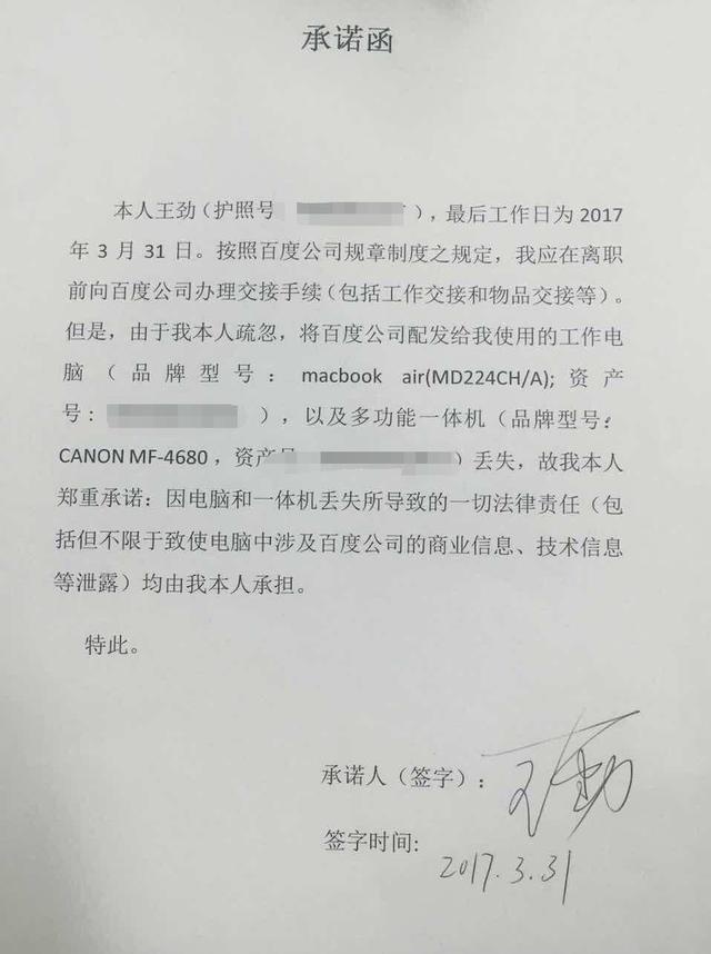 但王劲在承诺书中说,由于本人疏忽,将百度配发给其使用的工作电脑及多功能一体机丢失。