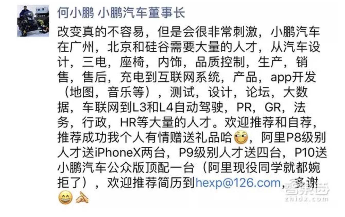 “小鹏汽车在广州、北京和硅谷需要大量人才。欢迎推荐和自荐,推荐成功我个人友情赠送礼品哈。阿里P8级人才送iPhoneX两台,P9级别人才送4四,P10送小鹏汽车公众版顶配一台。”为了招人,何小鹏的朋友圈里直接写出了有奖推荐政策。