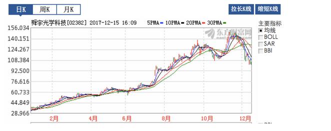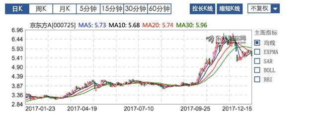 除了舜宇光学外,在港股中手机结构件巨头比亚迪电子也开启了暴涨行情,从年初的低点5.5港元/每股附近,到10月13日创下了26.45港元/每股,涨幅高达4.8倍。A股中,同样是光学领头的欧菲光股价翻倍、屏幕龙头京东方也走出了超级行业,最高股价翻了近2倍,市值创下记录超过2000亿。(下图:京东方A 2017年股价走势)