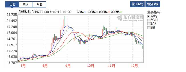 而从整个12月份看,手机概念股以欧菲科技、蓝思科技、比亚迪、舜宇光学、丘钛科技、立讯精密、科森科技、德赛电池等股价都纷纷在下跌。(图:丘钛科技3个月股价被腰斩)