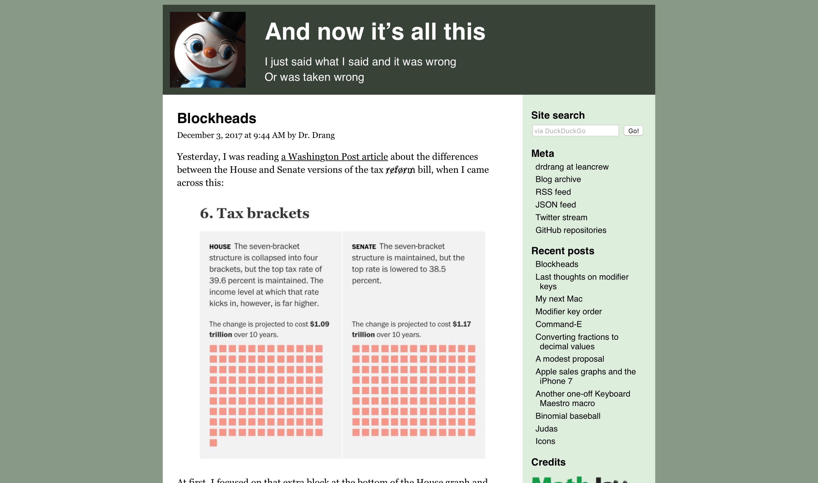 听过一种说法:越是简陋的网站,往往干货越多。我没有考证过这句话在多大程度上成立,但 Dr. Drang (一个来自德语词「压力」的假名)这个名字奇怪的博客 And now it’s all this(引自列侬的一段道歉)确实很丑、也确实干货很多。第一次打开这个博客时,绿油油的背景,等于没有设置字体的字体设置,以及顶部那个完美触发恐怖谷效应、笑容诡异的雪人头像,着实把我吓得不轻;但它很快就靠文章的质量弥补了我的心理障碍。