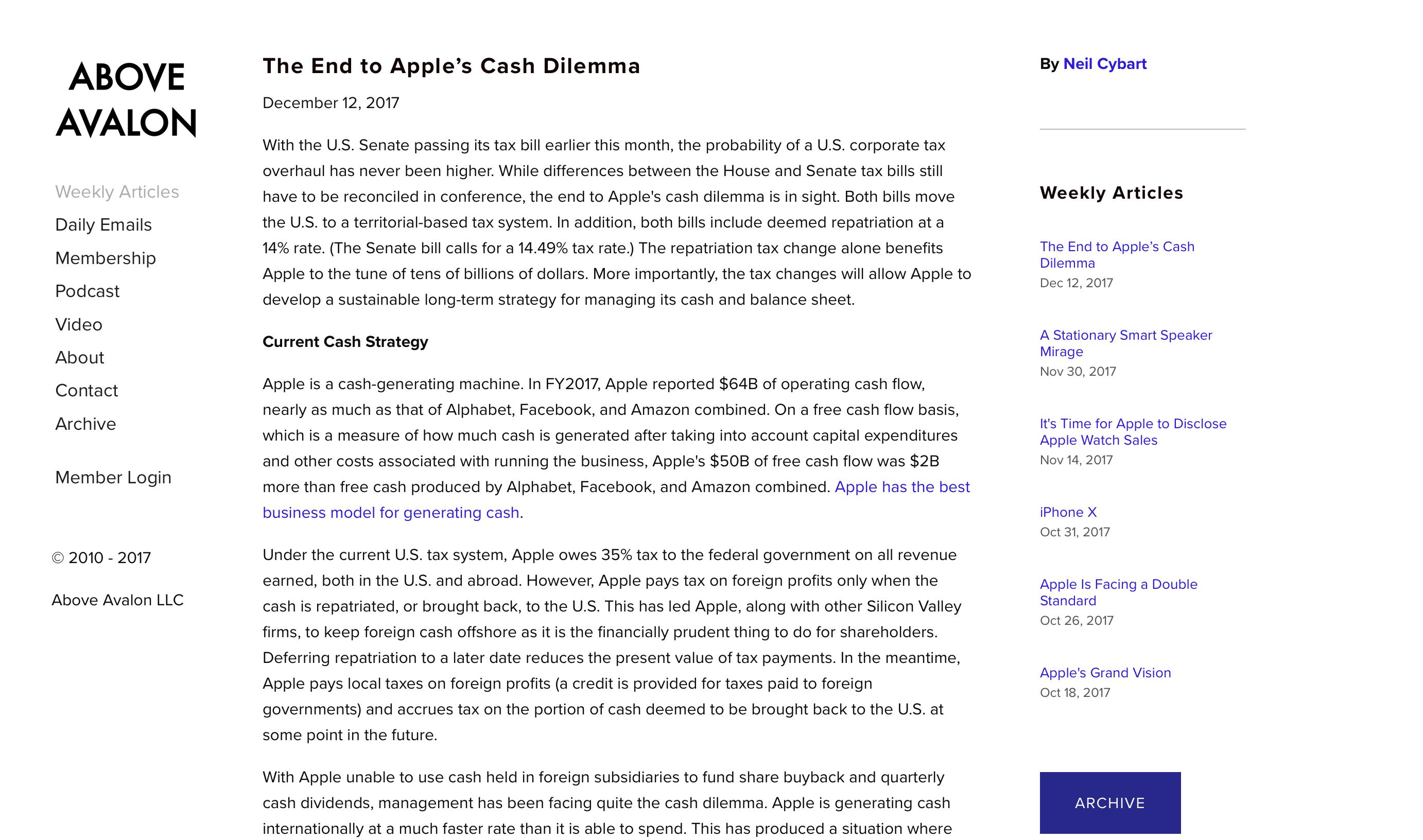 在苹果圈中,大多数内容生产者的背景都是开发者或资深用户,因此,他们所发表内容的视角也相应多是技术性的或体验性的。但是,要真正理解苹果公司作为一家上市公司的决策和战略,仅仅有这些视角是不够的。Above Avalon 就是一个很好的补充。博主 Neil Cybart 原本是一位华尔街证券分析师,因个人兴趣开始从金融和商业角度分析苹果并创办该站,取得成功并全力投入于此。目前,该网站每周会更新一篇免费长文,同时通过出售会籍获得收入。