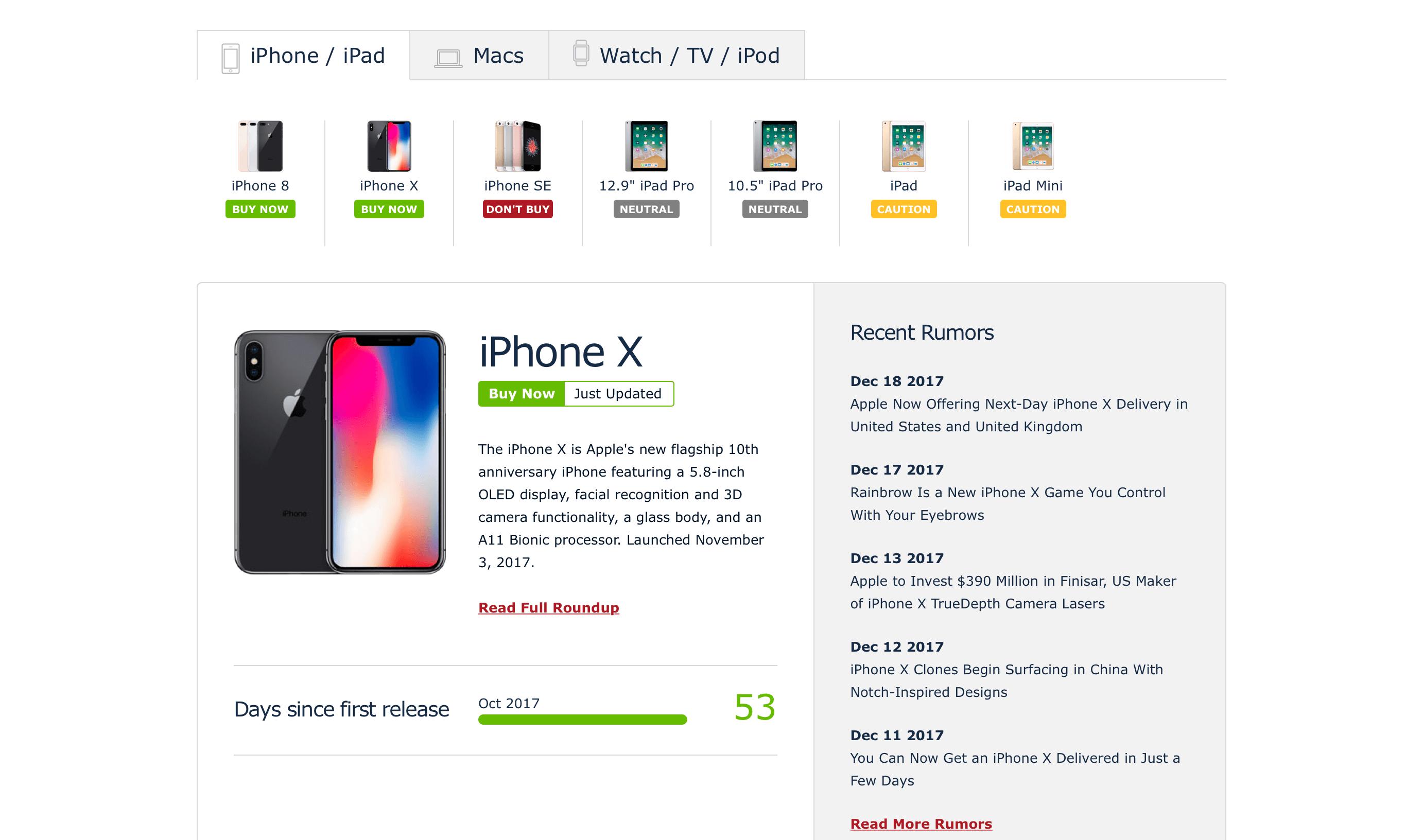MacRumors 的另一项实用功能是其 Buyer‘s Guide 板块。该页面列出了苹果各产品的上市天数和历史平均更新周期,并据此给出现在是否值得购买的建议。几个月前,在舆论对苹果忽视 Mac 产品线的批评达到高潮时,很多人正是用这个页面的截图来揶揄苹果的「不作为」的(最老的 Mac Mini 已经超过 1000 天没有任何更新了)。