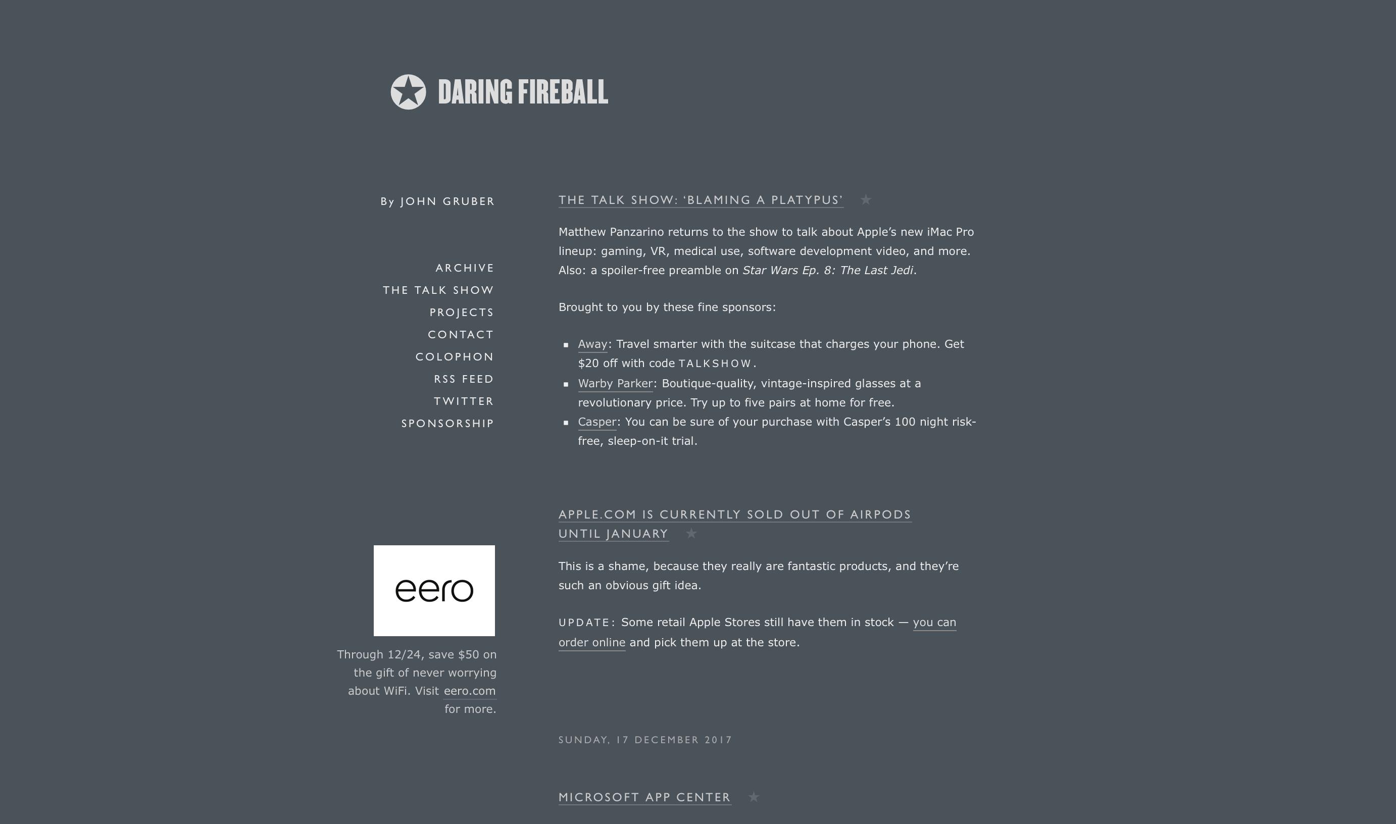 Daring Fireball 另一项「招牌」特征在于网站朴素到简陋的页面风格:铅灰的页面搭配白色、小到让人是不是故意戕害读者视力的 Verdana 字体,再加上左下角永远只有 120*90 像素大小的低调静态广告(广告位租价每周 9000 美元),除此之外再无其他元素。这种充满古早味的设计,以及坚持使用的 .net 顶级域名,似乎也象征着 Gruber 对独立、自由这些早期互联网精神的坚守。