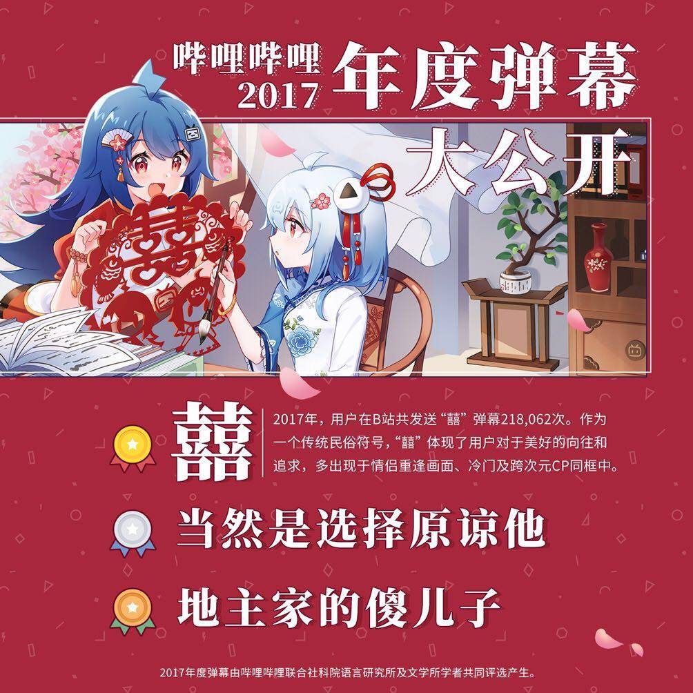 公元2017年12月20日,国内领先的年轻人文化社区哔哩哔哩(B站)公布年度弹幕。“囍”击败了众多人气弹幕,加冕年度弹幕。