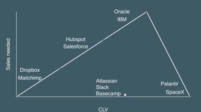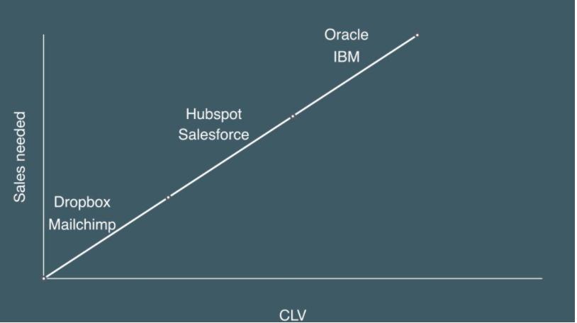 一个普遍的法则是,你产品的价格越高,你需要的销售就越多。在上面的图表中,你会发现,像Dropbox和Mailchimp这样的自助式服务的公司处在左下端。这类公司几乎没有销售人员,因为他们的CLV(客户生命周期价值)很低,他们的产品非常简单,不需要专门的销售团队去销售。