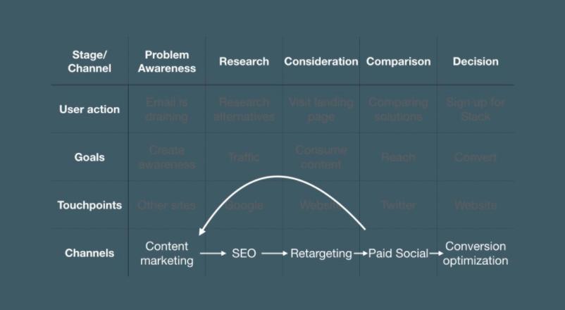 向下面这样填充用户旅程矩阵可以帮助你通过查看每个阶段使用的不同渠道来识别营销飞轮。你可以在这里很容易地发现这个过程,但是必须用数据来验证它们。