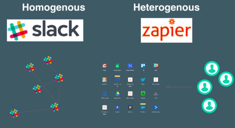有两种类型的网络效应:同质性网络效应和异质性网络效应。在SaaS领域,我们通常遇到的都是同质性网络效应。在同质性网络中,用户之间是彼此相连的(如Slack)。异质性网络是平台型市场,用户或者与应用相连(如Zapier),或者与另一类用户相连(如Airbnb)。