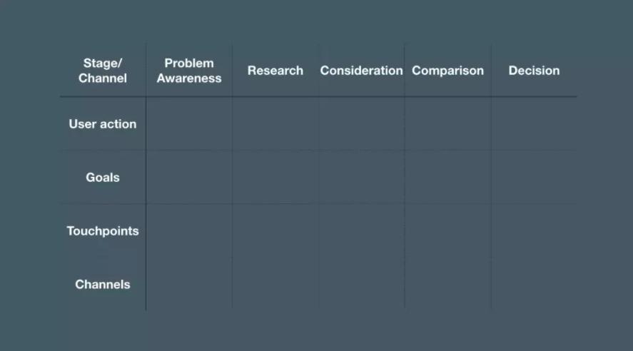 创建营销飞轮的方法有很多,但最有效的方法是查看用户的旅程。用户旅程的几个不同阶段有几个不同的触点。用户旅程阶段包括“ 发现问题”、“调研”、“考虑”、“对比”和“转化”。不过,不同产品的用户旅程是有所差别的。
