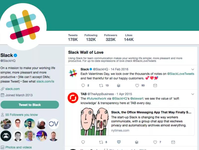 很多人认为社交媒体并不适用于B2B产品的推广。这是一种错误的观点。以Slack为例,Slack利用Twitter成功实现了早期的口碑传播。他们将用户的推文固定在“爱之墙”上,这是一种向客户展示自己价值的高效、有创意的方式,同时也能带来社会证明。
